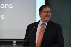 罗伯特·沃岳教授讲座的题目是“特朗普时代美国印第安人的生活现状”(“Native Americans in the Trump Era”)。沃岳教授首先用一张地图清晰地展示了目前美国印第安人的人口分布状况,以及印第安人作为一个群体在教育、就业、生活等方面面临的严峻挑战。然后,他重点介绍了他所在的奥萨治族人(the Osage Nation)目前的生活状况、他们奋斗的历史、取得的成就。沃岳教授通过一个个感人的故事,讲述了他的族人、他的家庭的奋斗史,无不令听者动容。